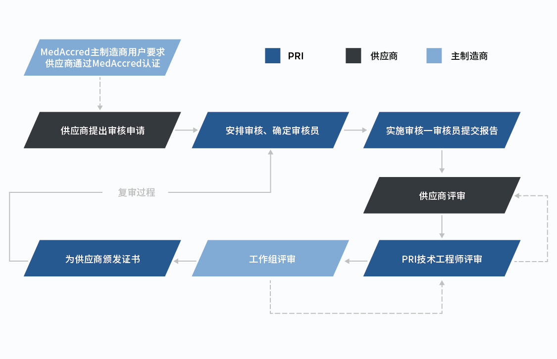 MedAccred审核和认证流程的设计在关键环节上得益于业界的意见,同时尽可能减少客户的工作量。最终,行业代表将就哪些流程需要审核以及哪些供应商获得MedAccred关键流程认证做出所有关键决定。